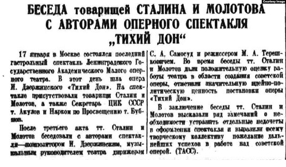 По рекомендации Д. Д. Шостаковича опера «Тихий Дон» была включена С. А. Самосудом в план Ленинградского малого театра оперы и балета (ЛМАТОБ), в октябре 1935 года была поставлена и вскоре вошла в репертуар многих музыкальных театров страны. Первое издание клавира вышло с посвящением оперы Д. Д. Шостаковичу. При вторичном издании клавира И. И. Дзержинский снял посвящение под влиянием редакционной статьи «Сумбур вместо музыки» в газете «Правда». В. И. Немирович-Данченко охарактеризовал оперу в «музыкальном отношении вещь совершенно посредственная». Он объяснял её очень большой успех тем, что она основана на сильном музыкальном (казацкие песни) и драматургическом материале[4].