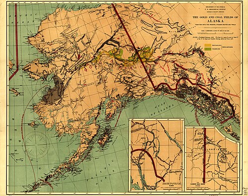 Карта Аляски и Британской Колумбии 1897 года с показанием месторождений золота.