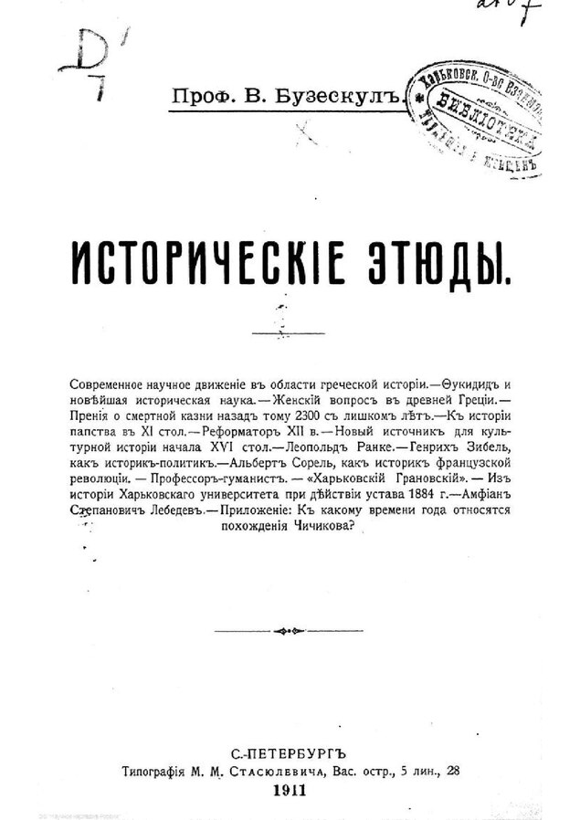 В 1911 году Бузескулом был издан сборник части мелких работ под заглавием «Исторические этюды», где, кроме исследований по греческой истории, есть статьи по древнему Египту, средневековью, культурной истории XVI в. и даже истории родной литературы, а также ряд блестящих характеристик таких мировых учёных, как Ранке, Зибель, Сорель, к которым автор присоединил М. С. Корелина, М. М. Лунина («Харьковский Грановский») и А. С. Лебедева.
