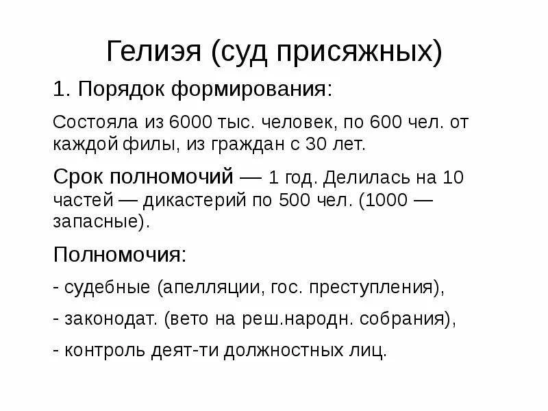 Судебные дела рассматривались в «суде присяжных» — гелиэе. Гелиэя состояла из 6000 человек, которые выбирались по жребию. Эти 6000 человек были разделены на 10 дикастериев, примерно по 500 человек в каждом (100 из них считались запасными). При рассмотрении дела оно рассматривалось определённым дикастерием, причём из-за многочисленности судей подкуп был практически исключён.