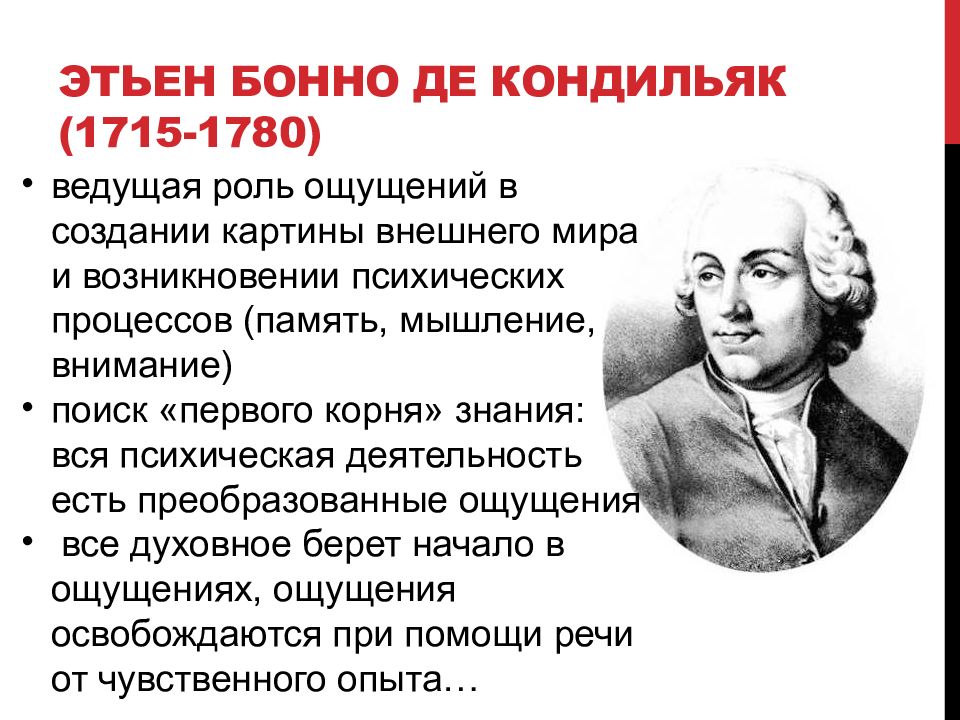 Другой представитель материалистического мировоззрения — Этьенн Бонно Кондильяк (1715—1780) также развивает сенсуализм Локка, отбрасывая учение английского мыслителя о внутреннем опыте (рефлексии). В своем «Трактате об ощущениях» Кондильяк подробно излагает мысль о зависимости всех наших идей от показаний органов чувств. Особое значение он придает осязанию. Метод Кондильяка носит отвлеченный характер, а в сенсуализме этого философа есть серьезный недостаток — одностороннее подчеркивание условного характера наших знаний.