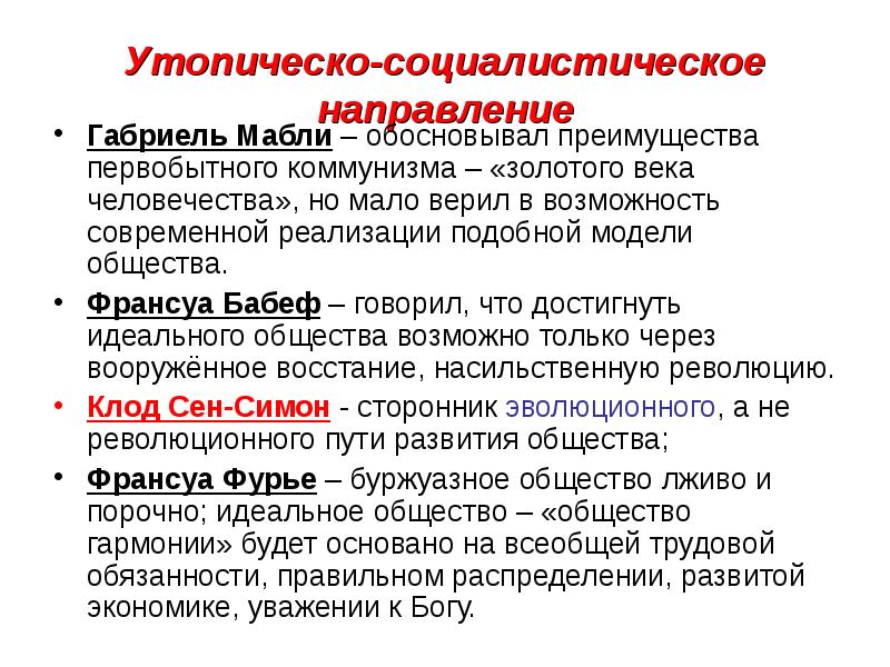 На левом фланге просветителей стоят, как бы продолжая Мелье, выдающиеся представители утопического коммунизма, которых можно рассматривать как идеологов складывавшегося пролетариата, — Габриель Бонно Мабли (1709-1785) и Морелли. Энгельс писал, что в каждом значительном движении буржуазии возникали самостоятельные выступления того класса, который был антиподом буржуазии и предшественником современного пролетариата. «Эти революционные вооруженные восстания еще не созревшего класса сопровождались соответствующими теоретическими выступлениями; таковы утопические изображения идеального общественного строя в XVI и XVII веках, а в XVIII веке уже прямо коммунистические теории (Морелли и Мабли)» (Ф. Энгельс, Развитие социализма от утопии к науке, К. Маркс, Ф. Энгельс, Избранные произведения, т. II, стр. 109. ).