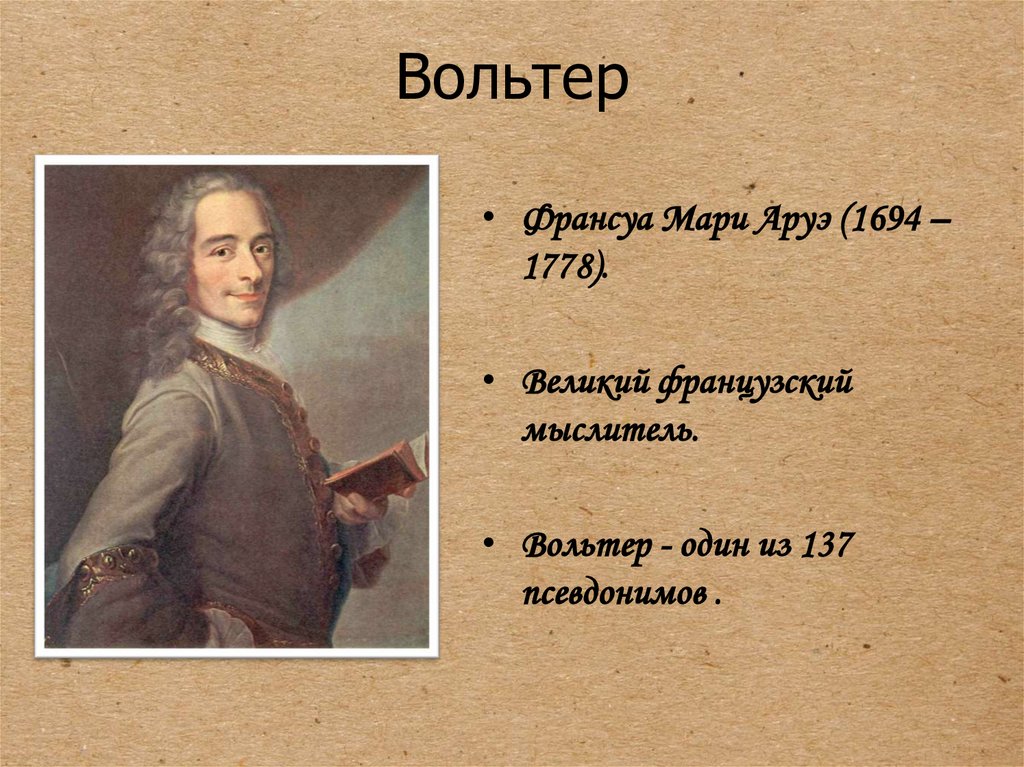 Самым выдающимся вождем умеренного крыла французского Просвещения был Вольтер (Франсуа Мари Аруэ) (1694—1778). Его огромный талант нашел выражение в разнообразных литературных, философских, исторических произведениях, блестящих по форме, насыщенных ненавистью к феодальному государству и религиозному фанатизму. Вольтер рано начал жизнь политического изгнанника и борца.