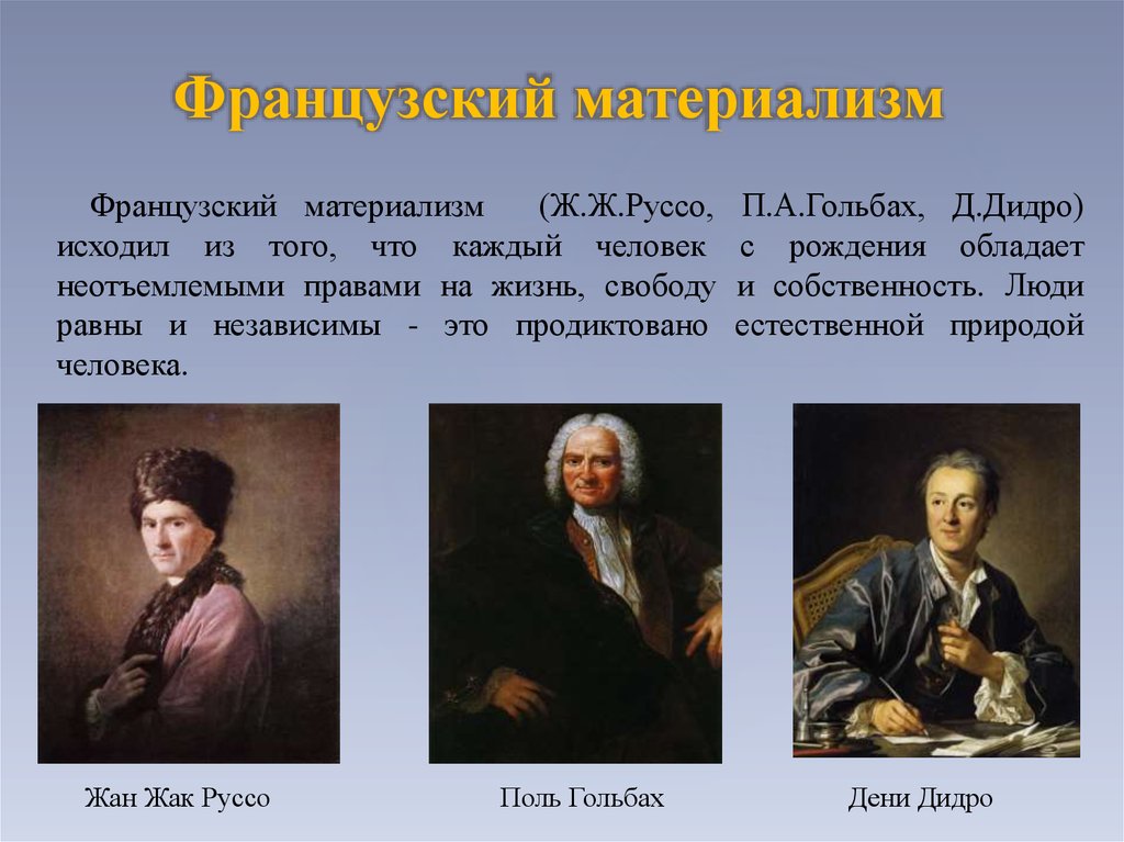 Рядом с Дидро стоит другой выдающийся мыслитель-материалист — Поль Гольбах (1723—1789). Его сочинение «Система природы», излагающее взгляды французской материалистической школы в последовательной связи и «трогом порядке, является до некоторой степени результатом сотрудничества целого кружка, собиравшегося в доме Гольбаха. Автор «Системы природы» был мастером атеистического памфлета. Блестящими образцами его антирелигиозной публицистики являются «Разоблаченное христианство» и «Карманное богословие». К числу выдающихся писателей-материалистов принадлежит также Клод Адриан Гельвеции (1715—1771), автор осужденного папой, Сорбонной и парижским парламентом сочинения «Об уме» (1758 г.) и лишь посмертно опубликованной книги «О человеке». В этих произведениях Гельвеции развивает принцип личной пользы, «разумного» эгоизма, который он считает основой всей философии истории.