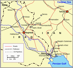 На севере 10-я индийская пехотная дивизия[25] генерал-майора Уильяма Слима вступила в центральную часть Ирана. Он приказал развернуть наступление дистанционно, по радио, с территории Индии. К тому моменту индийские пехотные и танковые подразделения находились в приграничном городе Ханакине в 160 км к северо-востоку от Багдада и в 480 км от Басры. В отличие от Хузестана, англичане вели наступление в горной местности остана Керманшах, преодолевая перевалы и узкие тропы[15].