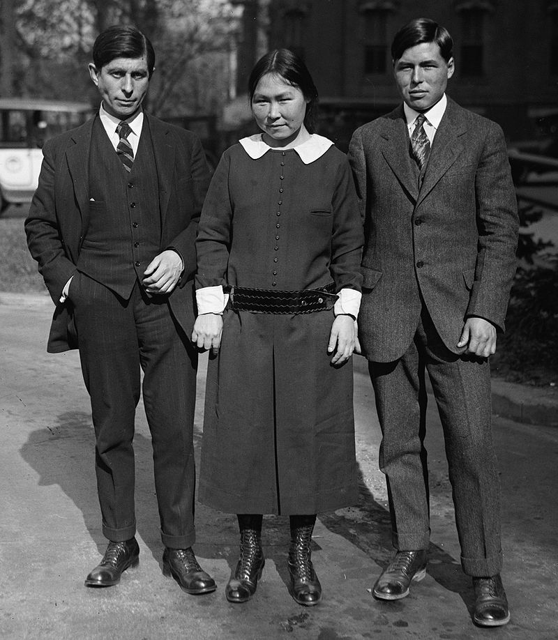 Датско-гренландский исследователь Кнуд Расмуссен (1879-1933) со спутниками-инуитами, г-жой Арналулунгуак и г-н. Митек, 3 ноября 1924 г. Источник: Wikimedia Commons