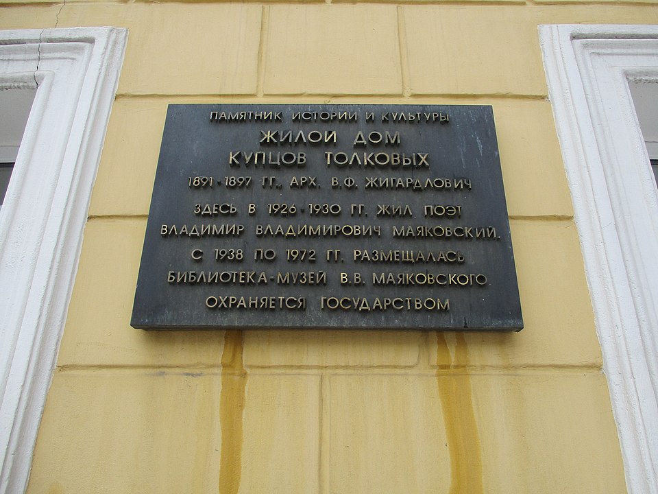 Памятная доска, посвящённая Маяковскому, по адресу пер. Маяковского, 15/13