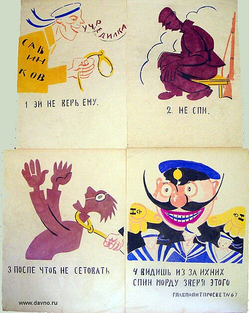 17 декабря 1918 года Маяковский впервые прочёл со сцены Матросского театра стихи «Левый марш». В марте 1919 года переехал в Москву, начал активно сотрудничать в РОСТА (1919—1921), оформил (как поэт и как художник) для РОСТА агитационно-сатирические плакаты («Окна РОСТА»). В 1919 году вышло первое собрание сочинений Маяковского — «Всё сочинённое Владимиром Маяковским. 1909—1919». В 1918—1919 годах выступал в газете «Искусство коммуны». Пропагандировал мировую революцию и революцию духа. В 1920 году закончил писать поэму «150 000 000», в которой отражена тема мировой революции[24].