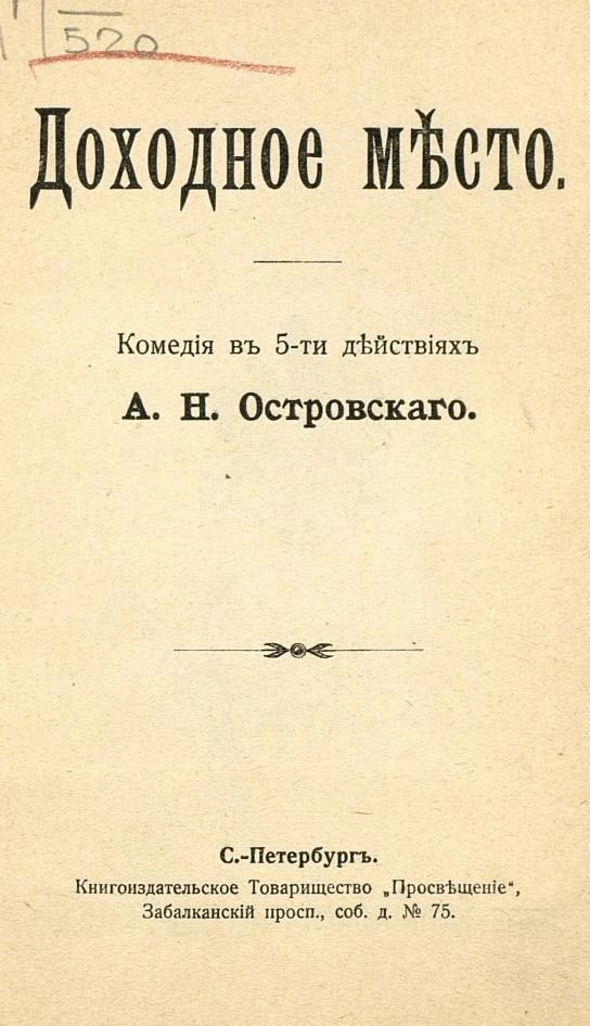 «Доходное место» — пьеса в пяти действиях Александра Николаевича Островского. Напечатана в журнале «Русская беседа», № 1, 1856 г.; в этом же году вышла отдельным изданием. Однако к постановке в театрах не была допущена. Лишь через шесть лет — 27 сентября 1863 г. — впервые поставлена в Петербурге, на сцене Александринского театра, в бенефис артистки Левкеевой; в московском Малом театре — 14 октября того же года, в бенефис артистки Васильевой.
