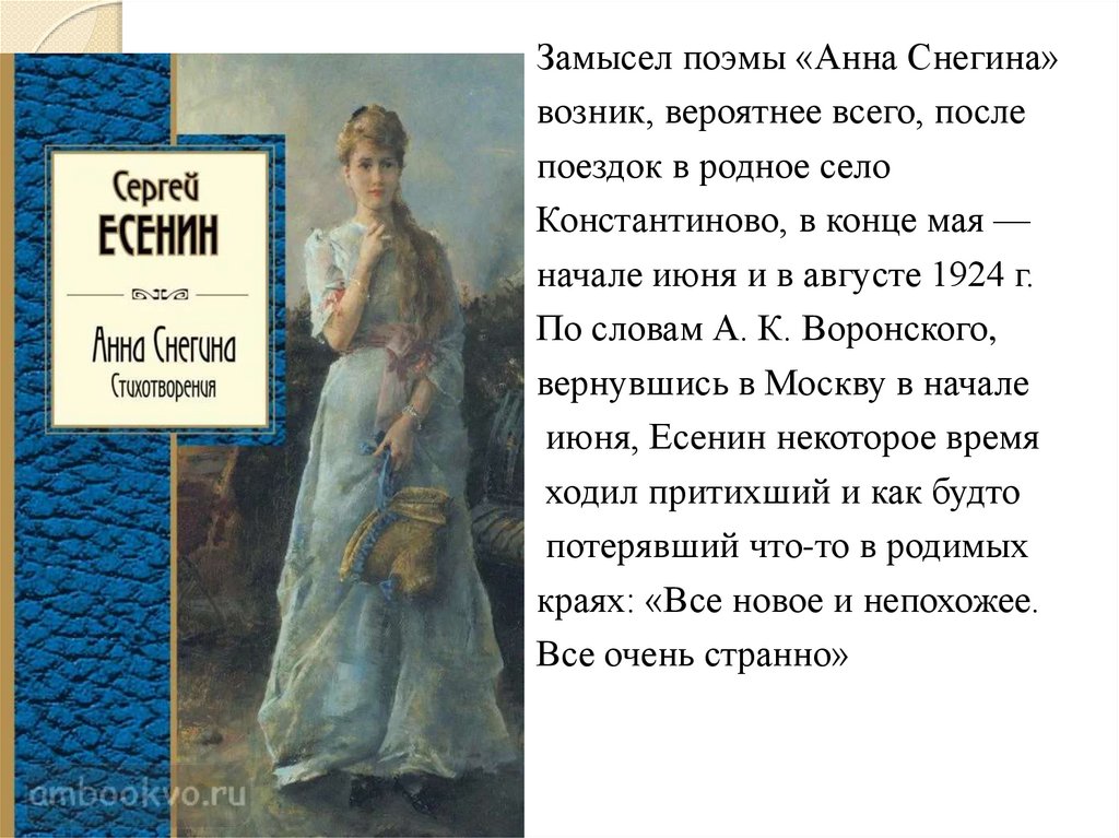 По мнению издателей «Полного собрания сочинений в семи томах» С. Есенина, замысел поэмы «Анна Снегина» возник, вероятнее всего, после поездок в родное село Константиново, в конце мая — начале июня и в августе 1924 г.[2] Писатель Ю. Н. Либединский вспоминал о впечатлениях, которыми делился с ним Есенин после поездки в Константиново в августе этого года: «— Знаешь, я сейчас из деревни… ‹…› А всё Ленин! Знал, какое слово надо сказать деревне, чтобы она сдвинулась. Что за сила в нём, а? ‹…› И всё, что он мне тут же рассказал о деревенских делах, потом, словно процеженное, превратилось в его знаменитых стихах о деревне и в „Анне Снегиной“ в чистое и ясное слово поэзии».