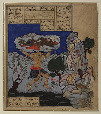 Деспот Зохак, прибитый к входу в пещеру на горе Демавенд, «Байсангурово Шах-наме» (1430)