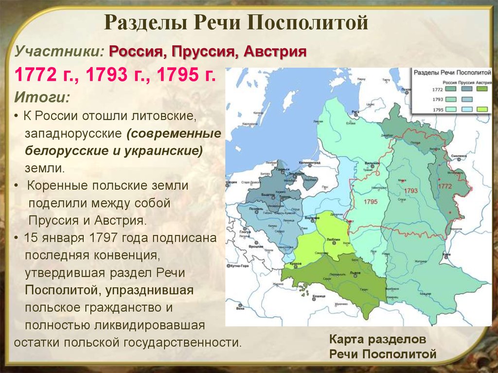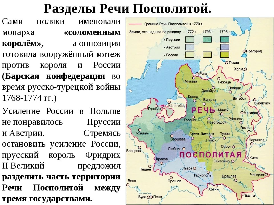 Пруссия и Австрия воспользовались напряженной обстановкой в Польше и приступили к захвату пограничных польских областей. В то же время, осенью 1768 г., Турция объявила войну России, вследствие чего значительные русские военные силы были отвлечены на новый театр военных действий. Правительство Екатерины II опасалось возможного выступления Австрии на стороне Турции. Кроме того, Екатерина II имела основание не доверять нейтралитету Пруссии, а главное не могла надеяться на прочность своего влияния в самой Польше. В этих условиях она дала согласие на раздел Польши. Первый раздел Польши был закреплен особым договором между тремя державами, подписанным в Петербурге 5 августа (25 июля) 1772 г. Пруссия получила Поморское воеводство (Запарную Пруссию без Гданьска), Вармию, Мальборкское и Хелминское воеводства (без Торуня), часть Куявии и Великой Польши. Австрия заняла всю Галицию, часть Краковского и Сандсмирского воеводств и Русское воеводство с городом Львовом (без Холмской земли). К России отошли часть Белоруссии — Верхнее Поднепровье, Подвиьье и часть латвийских земель — Латгалия.