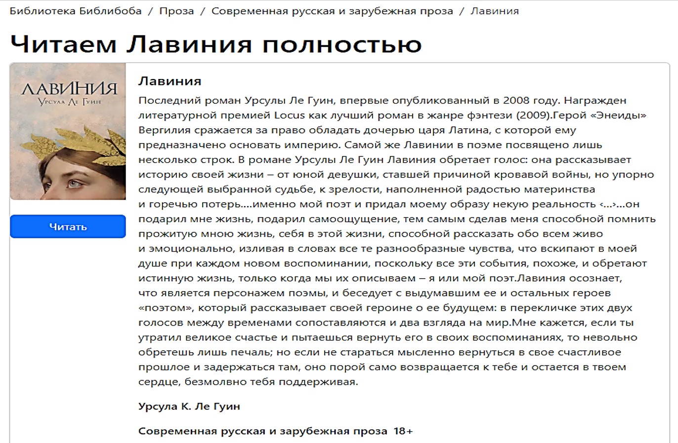 Роман можно условно охарактеризовать как фанфик по «Энеиде» Вергилия, написанный от лица второстепенного персонажа поэмы: Лавинии, дочери царя Латина. Вергилий уделяет ей совсем мало внимания — несмотря на то, что она предназначена в жёны главному герою, Энею.