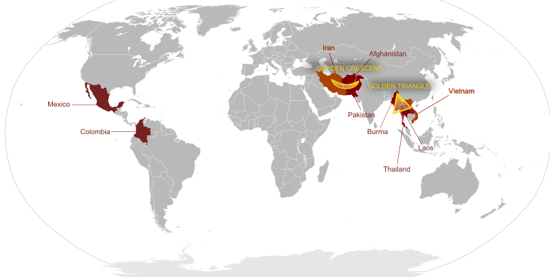 Карта мира с выделенными областями производства героина