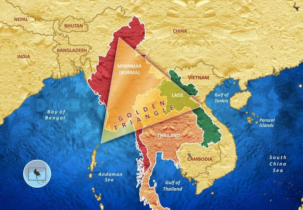 Золотой треугольник — географическая зона, расположенная в горных районах Таиланда, Мьянмы и Лаоса (по некоторым источникам также — северо-восточного Вьетнама и южного Китая), где в середине XX века возникла разветвлённая система производства опиума и торговли им, с участием организованных криминальных синдикатов, связанных с местными и мировыми элитами[1]. Мьянма является вторым по величине производителем опиума в мире после Афганистана, производя около 25% мирового опиума. Производство опиума в основном сосредоточено в штатах Шан и Качин[2][3].В декабре 1949 года проигравшие гражданскую войну в Китае остатки сил Гоминьдана, не сумевшие эвакуироваться на Тайвань, были вынуждены бежать в Бирму. Там они закрепились в восточной части штата Шан (Юньнаньская антикоммунистическая армия) и взяли под свой контроль транспортировку выращиваемого в штате опиума[4].